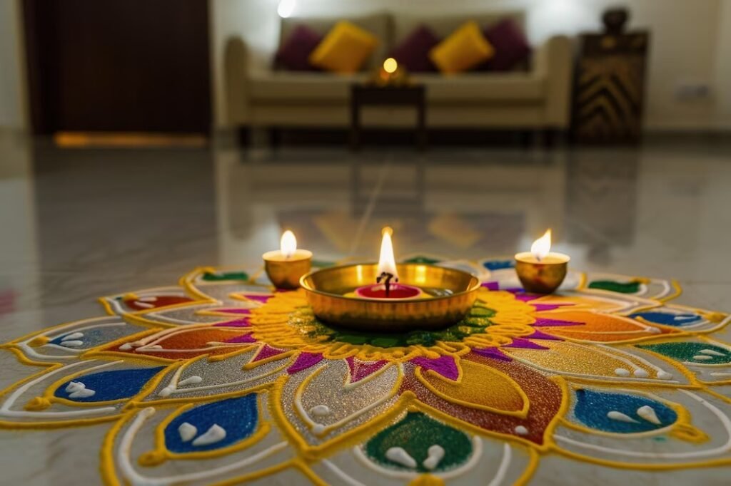 - Golden pendant lamps or handcrafted diya chandeliers for an opulent aura.